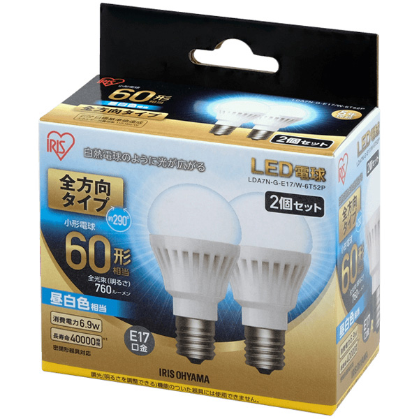 | 商品名 | LED電球 E17 全方向 60形相当 昼白色 2個セット |