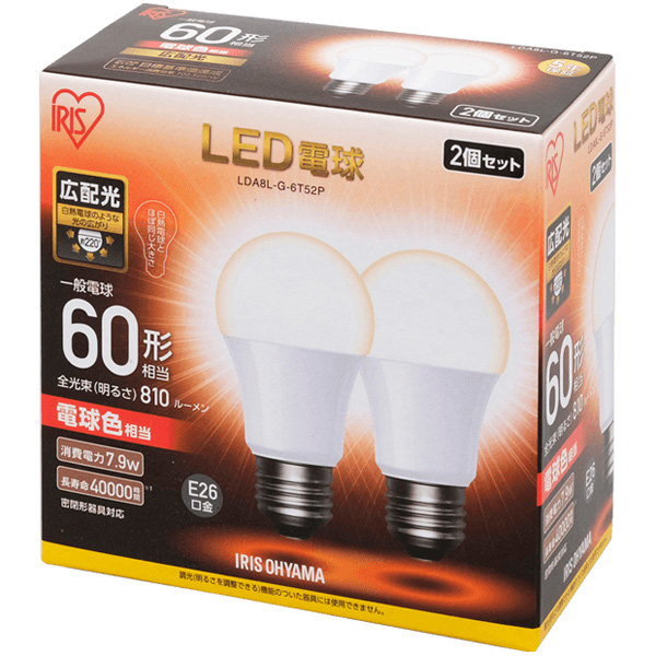 商品名 LED電球 E26 広配光 60形相当 電球色 2個セット