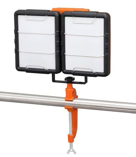 固定して空間全体を広く明るく照らすLEDクランプライトです。防塵・防水設計(IP65準拠)で、建築、工事現場などでも安心してお使いいただけます。2灯の向きを変えて照射範囲を調整することができます。拡散ワイドパネルで、眩しさを軽減します。背面に連結用コンセントが付いています。最大4A、400Wまで給電可能です。連結可能台数は4台までです。