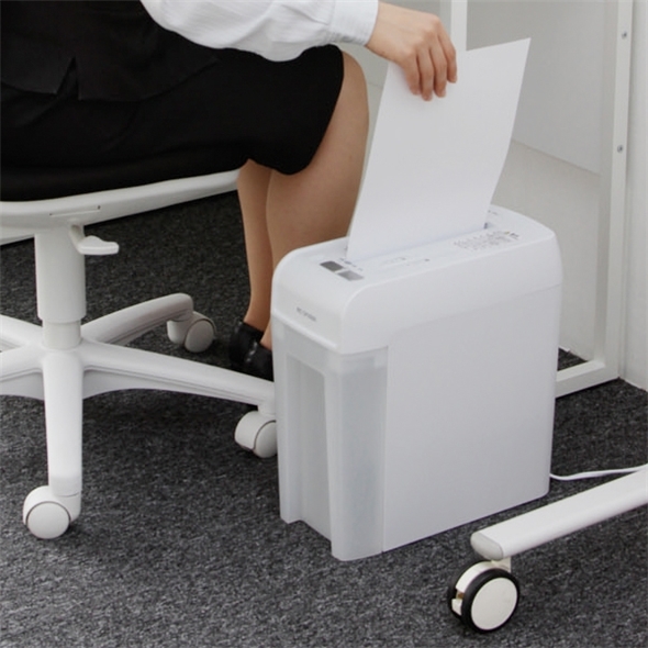A4サイズのコピー用紙を5枚同時細断可能なクロスカットタイプのシュレッダーです。オフィスでも気にせず細断できる静音タイプ。ゴミ箱は細断くずが見えやすいクリアボックス仕様なので、ゴミの量を確認しやすく便利。斜め挿入口仕様で紙の挿入がスムーズにできます。