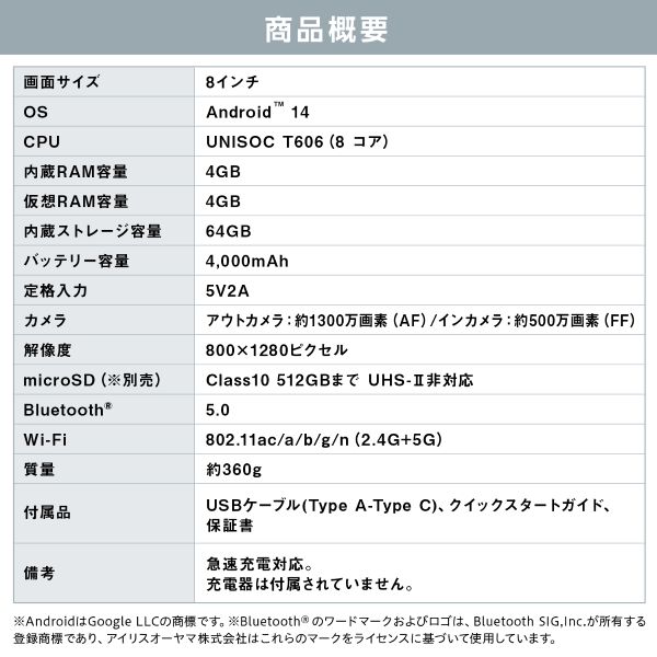| 商品名 | タブレット LUCA (T606/4GB/その他UFS64GB/Android14/8型/SIMスロット:なし) |