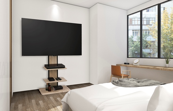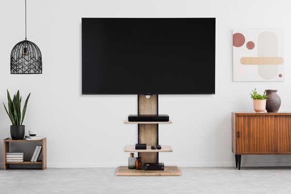 お部屋の空間を有効活用でき、お部屋になじみやすい木目調デザインで、おしゃれなインテリアにもなるスタンドテレビ台です。棚板・テレビ本体は、お好みに合わせて細かく高さ調節できます。ケーブルホルダー付きで、背面で配線をすっきりまとめられます。耐震実験済みで、安心設計です。※付属の転倒防止ワイヤーをご装着ください。※外部機関にて耐震試験を実施済みです。すべての環境での耐震性を保証するものではありません。高さ調節可能な棚板が2枚ついているので、使用シーンに合わせてカスタマイズできます。お好みに合わせて、ブラックオーク、オフホワイト、ライトナチュラルの3カラーから選べます。