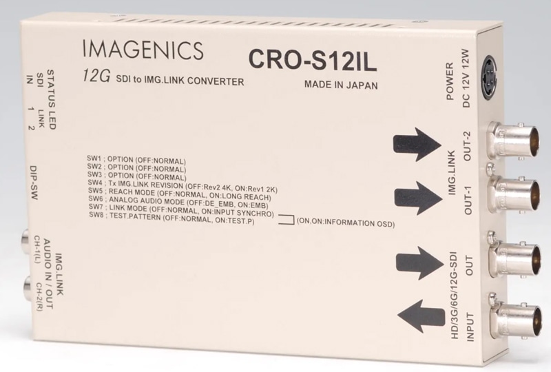 イメージニクス社製CRO-URS2A等のIMG.Link受信器との組み合わせにより、12G-SDIの映像信号を同軸ケーブル1本で最大210mまで伝送します。