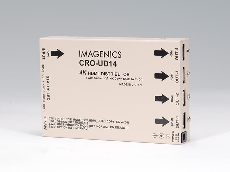 HDMI 1.4/HDMI 2.0に準拠したEDIDエミュレーション機能およびケーブル補償器付きのHDMI信号1入力4分配器です。4K→フルHDへのダウンコンバート機能や、4K@60444から4K@60420カラー変換機能にも全自動で対応します。
