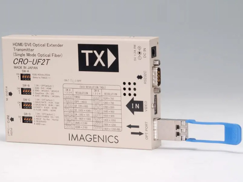 4K HDMI信号を非圧縮でシングルモード光ファイバコード1本で最大2kmまで伝送します。HDMI音声をアナログ音声でデエンベデッド機能も搭載します。RS-232C信号も同時に光伝送可能です。