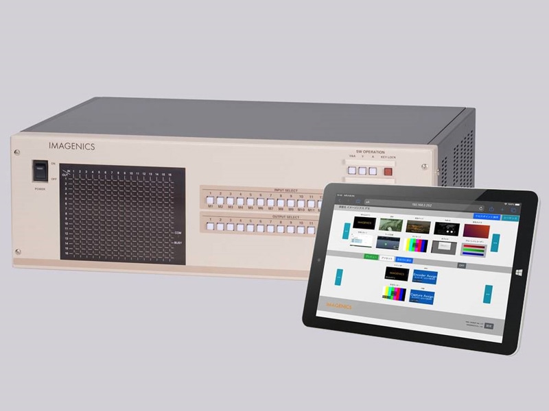 イメージニクス社製スイッチャーをグラフィカルなインターフェースでコントロールするシステムです。タブレット、 スマートフォンやパソコンの画面上で、スイッチャーに入出力する映像のサムネイル画像を見ながらの入出力の切り替え操作や、入力映像のプレビュー(動画)を見ることができます。また映像入力を一定の時間ごとに切り替えるシーケンス機能(曜日・時間のスケジュール管理に対応)や、スイッチャーの入出力状態(クロスポイント状態)をプリセットしたり、それを呼び出したりすることもできます。