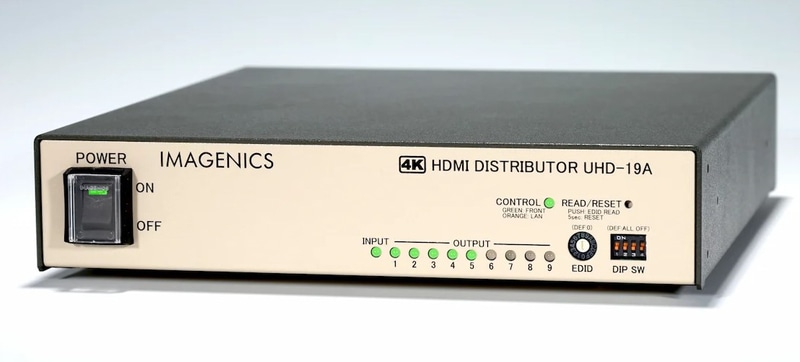 4K HDMI信号に対応した1入力9出力の多機能型HDMI分配器です。HDMI 信号からのアナログ音声デエンベデット機能および HDMI 信号へのエンベデット機能にも対応します。