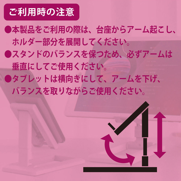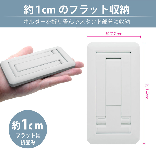◇持ち運びに最適なモバイルスタンドです。◇小さくたたんで持ち運べるので、出先でスマホやタブレットを利用したテレビ電話やオンライン会議、オンライン授業等で便利にご使用いただけます。◇最適な角度&高さに調節(ホルダー部分で角度を調節し、アームで高さを調節できます。)◇充電しながら使える(ホルダー底部から充電ケーブルを通すことができるので、充電しながらオンライン会議を続けることができます。)◇選べる2カラー(ブラックとホワイトの2カラーをラインアップ。)主な仕様・サイズ:約7.2×14×1cm(収納時)/約7.2×14×15cm(展開時)・重 量:約70g・対 応:約4.7~11インチ、厚さ 約1cmまでの機器