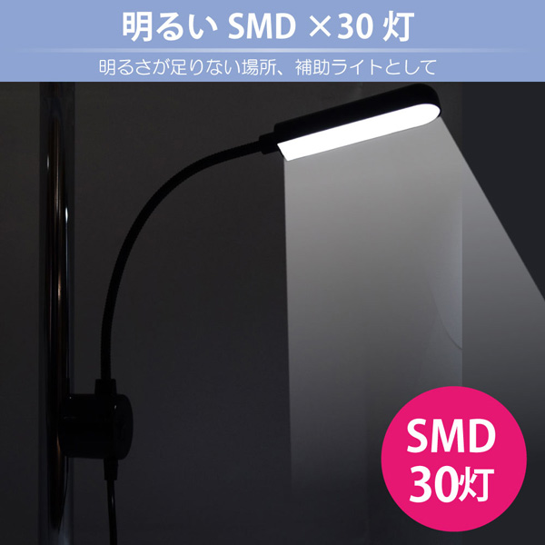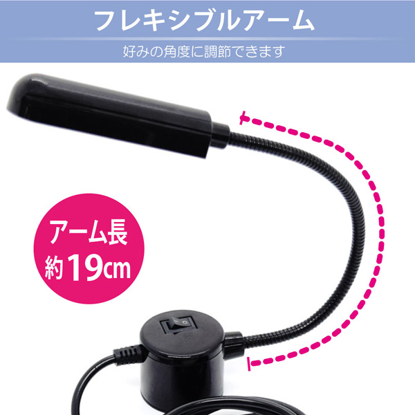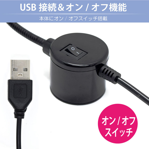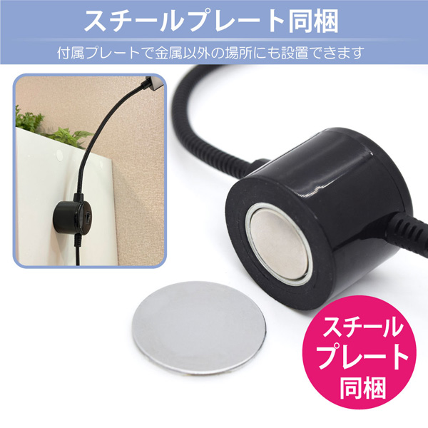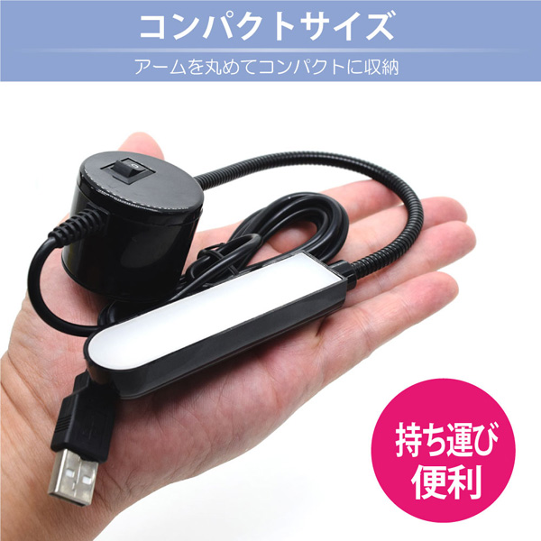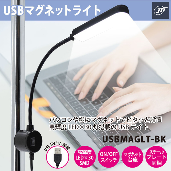 ・SMD×30灯搭載・USB電源(5V/1A)・マグネット搭載台座・約19cmのフレキシブルアーム・スチールプレート同梱■マグネット搭載ライト本体にマグネットを搭載。スチール材質に しっかりとくっつき、簡単に手元に明かり がほしい時などに活躍します。LEDはSMD×30灯で小型でも明るい。■フレキシブルアームフレキシブルアームで、お好みのアングル に簡単に調節できます。アーム長は約19cm。■USB&ON/OFF電源は省電力のUSB接続なので、様々なシーンで活用できます。本体にON/OFFスイッチ搭載。■コンパクトサイズアームを丸めれば手に収まるコンパクトサイズ。持ち運びにも最適です。■スチールプレート同梱スチールプレート付属なので、鉄製のもの でなくても両面テープで貼り付けることもできます。※粘着が弱い素材がありますのでご注意下さい。■製品仕様商品名 USBマグネットライト ブラック型番 USBMAGLT-BKサイズ 約40×330×35mmケーブル長 約125cm重量 約110g消費電力 6WLED SMD×30灯