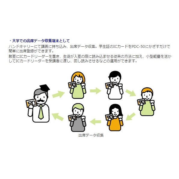 持ち運び運用に特化したICカードリーダー。パソコンを使わなくても、読み取ったICカードやおサイフケータイの情報を読み取り時間と合わせて、本体内に記録します。読み取ったデータは、USBケーブルやパソリを使って簡単に取り出します。バッテリー搭載で、小型軽量ですので、持ち運び運用に適しています。・来場者情報管理に。展示会などで通常の受付システムでは受付に電源(コンセント)の確保や、パソコンの用意が手間になります。PDC-50なら、受付にパソコンや電源を用意しなくても、来場者の受付情報を収集できます。展示会受付端末として使用できます。・大学での出席データ収集端末として。ハンドキャリーにて講義に持ち込み、出席データ収集。学生証のICカードをPDC-50にかざすだけで簡単に出席登録ができます。教室にICカードリーダーを置き、生徒が入室の際に読み込ませる従来の方法に加え、小型軽量を活かしてICカードリーダーを受講者に渡し、回し読みさせるなどの運用が可能です。代替機の貸出にも対応した5年保証(5年サポートサービスパック)付き商品です。