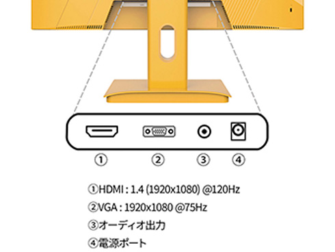 | 商品名 | ゲーミング液晶ディスプレイ 23.8型/1920×1080/HDMI×1、VGA×1/イエロー/スピーカー有/2年保証 |