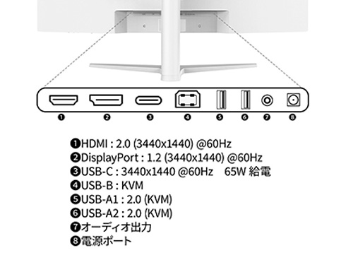 商品名 液晶ディスプレイ 34型/3440×1440/HDMI×1、DP×1、USB-C×1/ホワイト/スピーカー有/2年保証