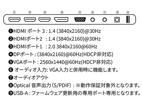 | 入力端子 | HDMI×3、DP×1、VGA×1 |