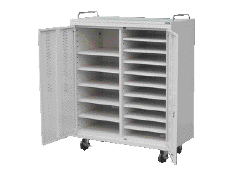 ●ノートパソコン用収納カート。●グリーン購入法適合商品。●ノートパソコンを最大20台収納ができ、棚板が調整できますので、PC以外も収納可能。●保管に安全な3点ロックキーを採用。●移動用に大型キャスターを採用。 ●本体背面・床面に通線孔を儲け外部からの電源が引き込み可能のため、保管中に充電可能。※送料別途お見積りとなります。