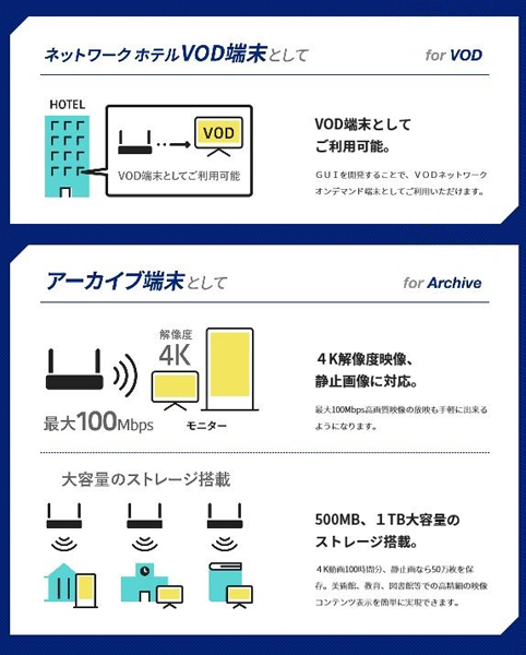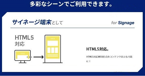 4K解像度の静止画、映像に対応。HTML5対応。WEB形式のコンテンツ表示も可能。システム及びアプリケーションにてトラブルが発生し停止した場合、ハードウエアーの電源再起動を、自動処理する機能を搭載(死活監視機能)。HDMI経由でモニターの入力切替。ON/OFFが自動で操作できる機能あり。外部LINE OUT出力付き。スピーカーがついていないモニターの場合、LINE OUTにスピーカーを接続して音声を出力することができます。ファンレス。45度迄温度対応。大容量CPUヒートシンク搭載で、放熱設計対応。画面回転機能搭載。90・180・270度回転可能。縦型モニターに対して常に16:9のスクリーン表示を可能に。時間保持用電池搭載。夜間ビル施設の電源OFFでも内部時計時間を保持します。タッチパネルI・F互換あり。タッチパネルモニターと併用でPOPシステムを低コストで開発することが出来ます。長期安定供給。自社工場での設計製造販売。安定した供給体制を実現しました。電源はAC電源から。バッテリーレスで安心設計。バッテリーの爆発・劣化によるシステムの起動が不安定になる心配はありません。
