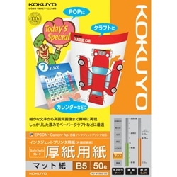 ●ペーパークラフトに/厚さ0.22mmとコシのある厚手タイプ。メニューやPOPなどのペーパークラフトに最適です。●優れた速乾性・耐久性/速乾性と耐水性に優れ、高精細な画像や文字もクリアに再現します。●紙厚/170g/m2・0.21mm●ISO白色度約91%●片面印刷用紙●B5・50枚入り