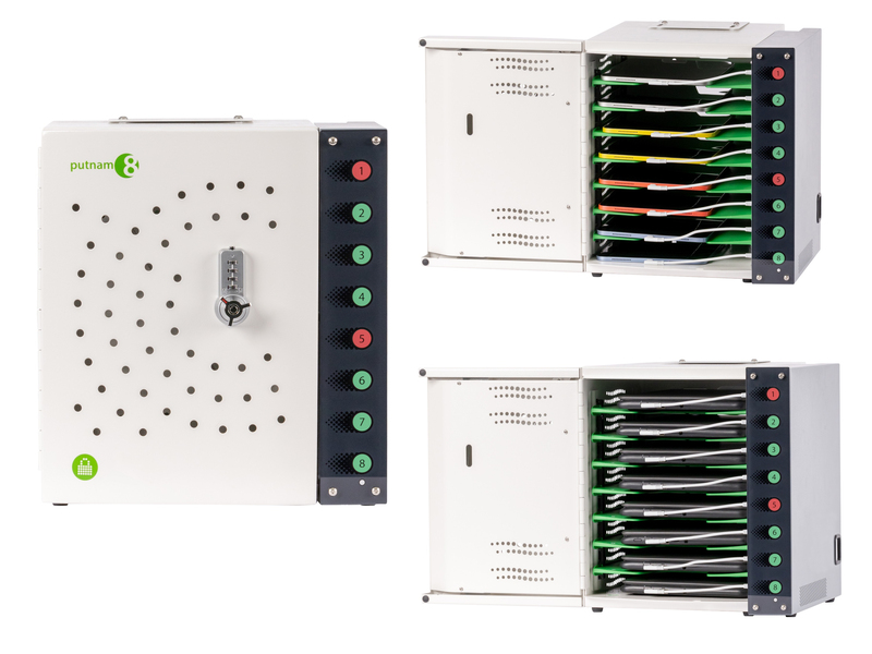 ■iPad、Chromebook、surface、MacBook、タブレット、ノートパソコンなど8台収納できる充電保管庫。 ■USB PD対応 ■Type-Cケーブル配線済み■タワー型・省スペースでコンパクトデザイン。卓上、卓下、場所を選ばず設置可能。■2段重ね可能。Putnam8/16の組み合わせで端末の台数に合わせて、将来の増台にも対応。■ドア一体型ダイヤル式ロックで鍵の管理不要。■スチール溶接構造による高い耐久性。■壁面への固定、輪番充電機能付きの床置き用の台座も利用可能(別売りアクセサリー)。■生涯保証付き(筐体)■組み立て不要の完成品でお届け。