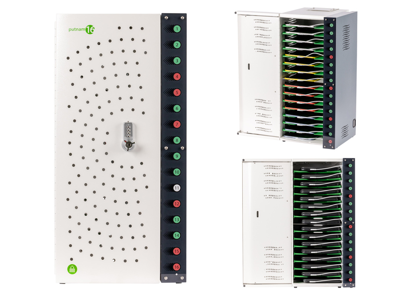 ■iPad、Chromebook、surface、MacBook、タブレット、ノートパソコンなど16台収納できる充電保管庫。 ■USB PD対応 ■Type-Cケーブル配線済み■タワー型・省スペースでコンパクトデザイン。卓上、卓下、場所を選ばず設置可能。■2段重ね可能。Putnam8/16の組み合わせで端末の台数に合わせて、将来の増台にも対応。■ドア一体型ダイヤル式ロックで鍵の管理不要。■スチール溶接構造による高い耐久性。■壁面への固定、輪番充電機能付きの床置き用の台座も利用可能(別売りアクセサリー)。■生涯保証付き(筐体)■組み立て不要の完成品でお届け。