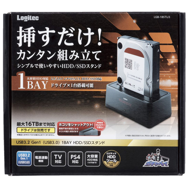 ■挿すだけの簡単組み立てで内蔵HDD/内蔵SSDを外付けドライブとして使用することが出来ます。 ■最大16TB HDDに対応しております。 ■2.5/3.5インチどちらにも対応しておりますので、幅広くデバイスを選択することができます。 ■差し込み口にホコリカバーが付いておりますので、未使用時にコネクタ部分に埃が侵入するのを防ぎます。 ■「電源連動機能」を搭載していますので、本体電源の切り忘れによる無駄な消費電力の低減が可能です。 ■対応パソコン:USBポートを搭載しているWindowsパソコンおよびIntelMacシリーズ ■対応OS(USB3.0接続時):Windows 10、Windows 8.1、macOS Catalina 10.15、macOS Mojave 10.14、macOS High Sierra 10.13、macOS Sierra 10.12、OS X El Capitan 10.11 ■インターフェース:USB3.2(Gen1)/USB3.1(Gen1)/USB3.0/USB2.0 ■コネクタ形状:USB Type B ■設置方向:水平 ■冷却ファン:無し ■筐体材質(カラー):ブラック ■盗難防止:無し ■入力電圧:DC+12V(2A) ■保証期間:1年間 ■法令対応:RoHS指令対応 ■付属ソフト:ロジテックHDDツール ■付属品:ACアダプタ1個、USB BtoAケーブル 約1m、セットアップガイド1部