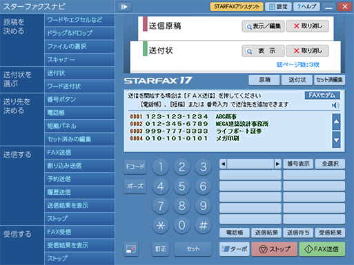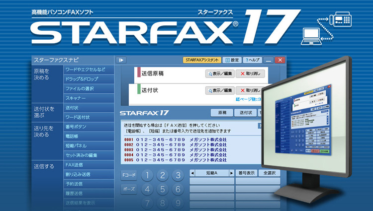 Windows11対応のパソコンFAXソフトです。パソコンで作った原稿を印刷せずにそのままFAX送信ができるので、印刷による送信原稿の劣化をおさえ、きれいな原稿を相手先に届けられます。また、グループFAX機能を使えば、同じLAN内にあるパソコンにSTARFAX 17のクライアントプログラムをインストールすることで、どのパソコンからでもFAX送信を行えるようになります。(クライアントを追加する場合、別途追加ライセンスが必要)受信したFAXを自動的に印刷したり、メールに転送することができます。