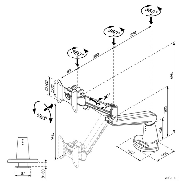 ◆垂直関節はガススプリングを内蔵しており、3kg~8kg以内のVESA規格75mmx75mmまたは100mmx100mmのネジ穴を持つモニターに対応しております。◆本体色 白色◆デスクマウント時のクランプは専用工具で締め、厚さ8mm~30mmまでの机天板に固定します。※耐荷重範囲内であってもモニター形状や重心により設置できない場合がございます