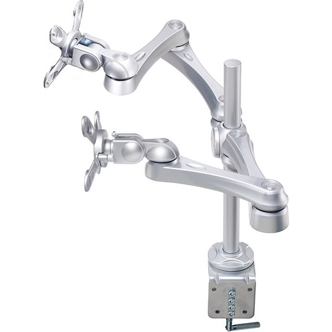 VESA対応液晶モニタ用水平多関節アーム(水平方向に2台設置)。机を挟むクランプタイプ。VESA75,100対応、先端の取り付けプレートはワンタッチで脱着可能です。耐荷重は各アーム~8KG未満。 RoHS他規制対応については御確認下さい。