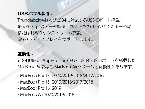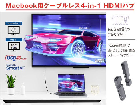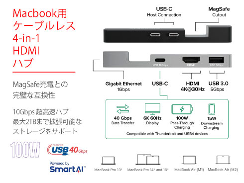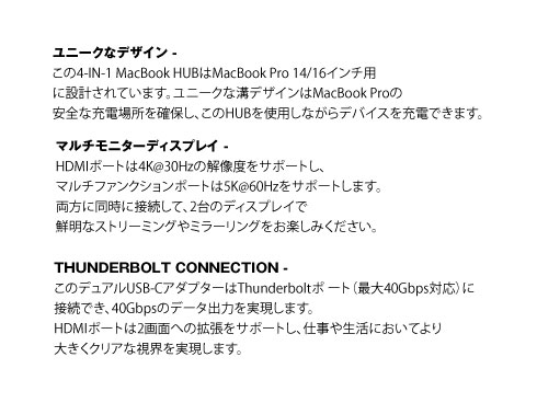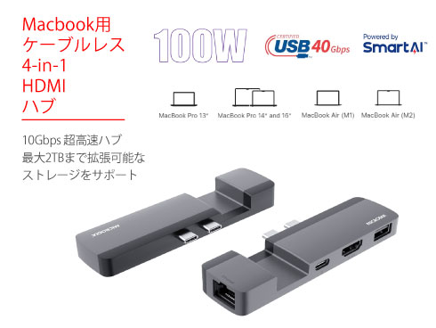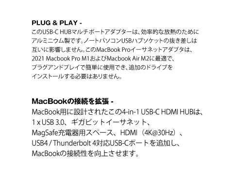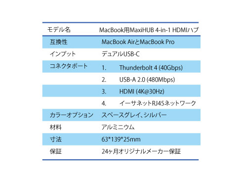 | 商品名 | MacBook用Ethernetおよび4Kディスプレイ用HDMI付きMaxiHUB 4-IN-1 HDMI HUB |