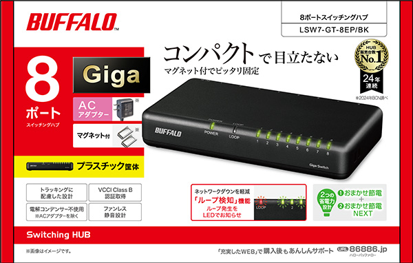 | 商品名 | Giga8ポート スイッチングハブ 電源外付け プラスチック筐体 マグネット付属 ブラック |