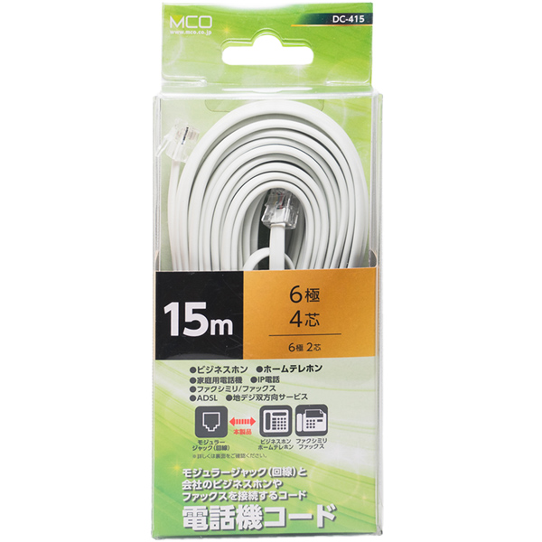 6極4芯 電話機コード 15m ホワイト