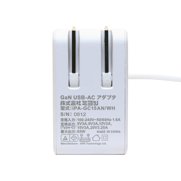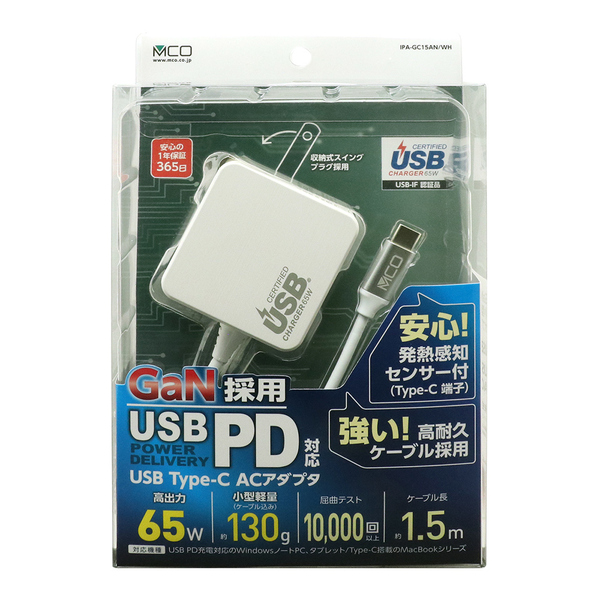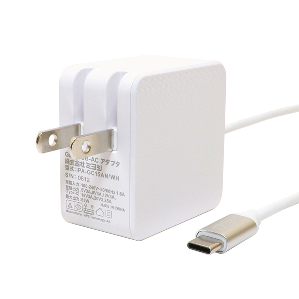 | 商品名 | USB PD対応 GaN USB-ACアダプタ ケーブル一体型 65W 1.5m ホワイト |