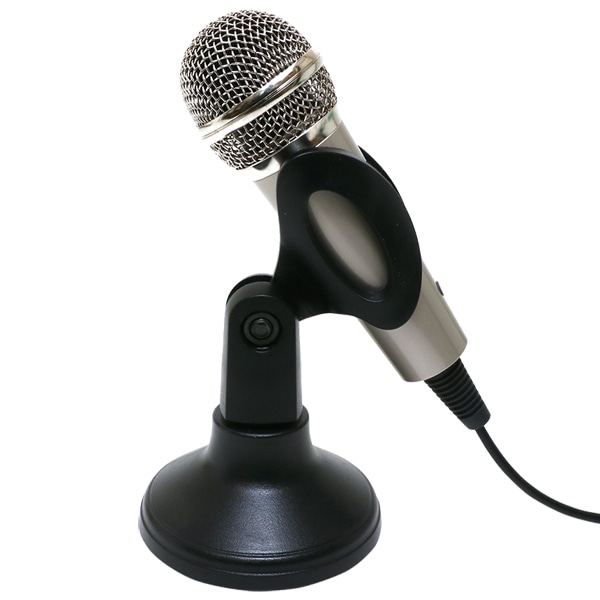 USBタイプの専用スタンド付きパソコン用マイク。持っても置いても使える。■持っても置いても使える専用スタンド付き。重量感のある専用スタンドで安定して使えます。オンライン通話にも使用できます。■声がキレイに伝わるウインドスクリーン付き。■台座には上下の角度調整機能付き。■オン、オフはスイッチで切り替え簡単。■USB接続タイプ。
