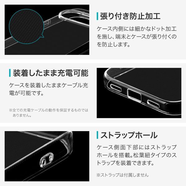 高透明で柔らかなTPUケース/柔軟性があり着脱が簡単/ボタンやカメラレンズ周りを保護する精密設計/マイクロドット加工で端末に張り付きにくい/ストラップホール搭載