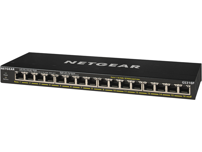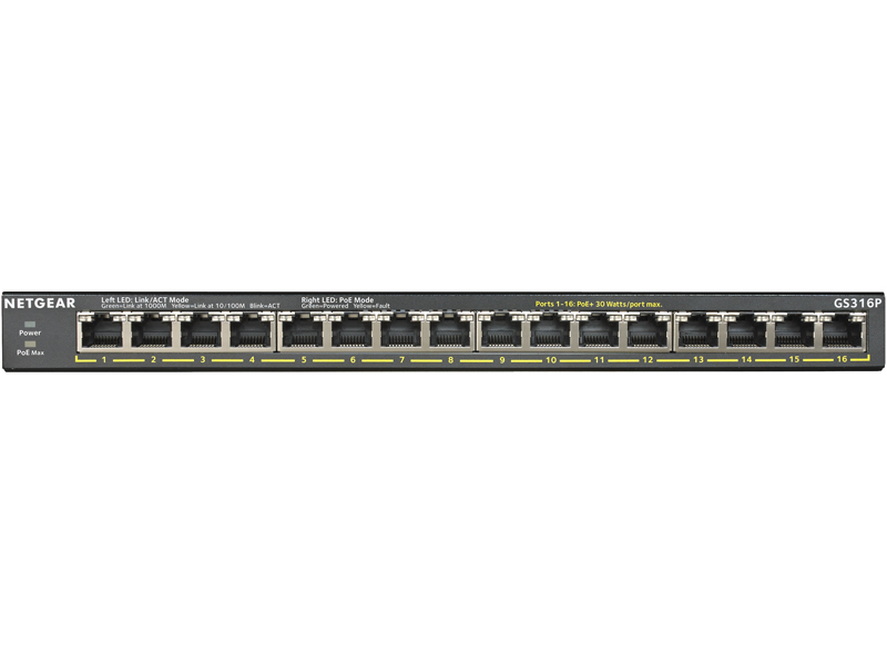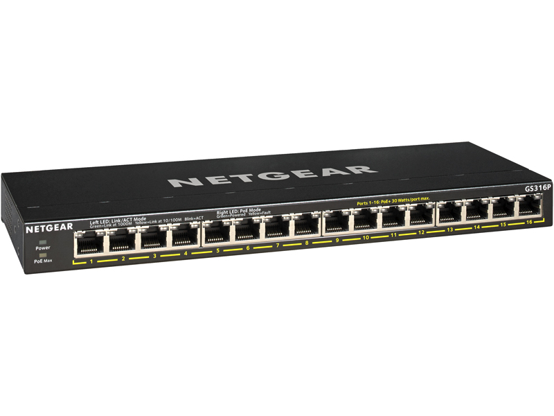 小規模オフィスや家庭内ネットワークでも、設定不要ですぐに使えるアンマネージスイッチ。PoE+給電に対応し、1ポートあたり最大30W、筐体全体 (1~16番ポート) で115Wを給電。また「GS316P」はFlex PoEに対応。別売りの電源アダプター(EPS200W-100JPS)に変更することで、最大183Wの給電容量をサポート。製品に壁掛けキットが付属しているため、設置のための追加キットの購入が不要。デスクトップサイズの省スペース+ファンレス設計により、長机の下からデスクトップまで、どこに置いても場所をとらずフレキシブルに設置可能。セキュリティカメラや無線APなどのPoE+受電機器をLANケーブルで給電することにより、電源ケーブルの配線に囚われないネットワークの構築が可能。製品保証3年・有償延長最大5年