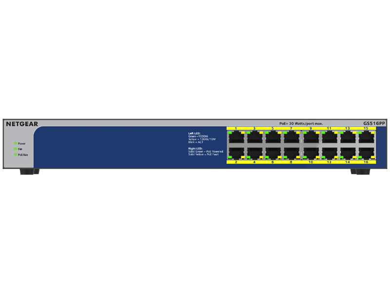 全16ポートがIEEE 802.3at PoE+対応 (1ポートあたり30W)で合計260Wの電力を供給可能な設定不要のアンマネージスイッチ。802.11ax ワイヤレスアクセスポイント、パン/チルト/ズーム(PTZ)および4K IPカメラ、PoE照明、オーディオスピーカー、ACエンコーダーなどのPoE+受電機器をLANケーブルで給電することにより、電源ケーブルの配線に囚われないネットワークの構築が可能になります。デスクトップの他にも、ラックマウント (キット付属) での設置も可能。リミテッドライフタイムハードウェア保証のため長期にわたり安心して使えます。
