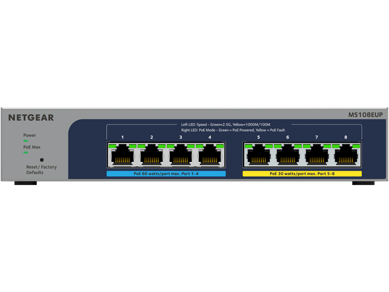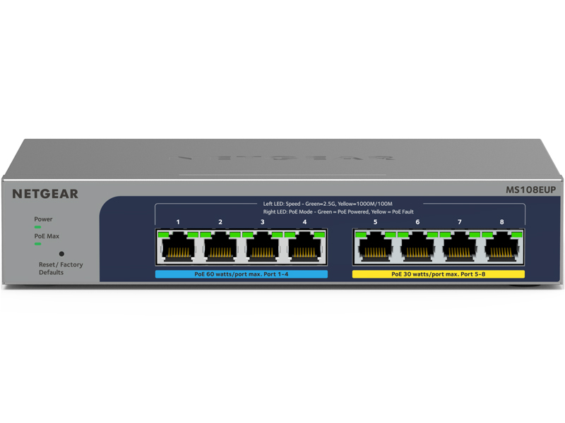1G/2.5Gマルチギガポートを8基搭載したアンマネージプラススイッチ。マルチギガポートは既存のCat5e/Cat6ケーブルを使用して2.5Gの高速スピードを実現できます。ポート1-4はIEEE802.3bt Ultra60 PoE++に対応(1ポートあたり60W)、ポート5-8はIEEE802.3at PoE+に対応(1ポートあたり30W)しており、スイッチ全体で230Wの電力を供給します。2.5Gポート搭載のWiFi 6対応アクセスポイントや高画質IPカメラの接続に最適です。日本語対応のWebベース管理画面で簡単に設定が可能。ファンレス静音設計のため、会議室など動作音を気にする場所にも設置できます。デスクトップ設置のほか、壁掛けキット付属で壁面への取り付けもできます。