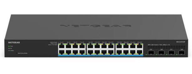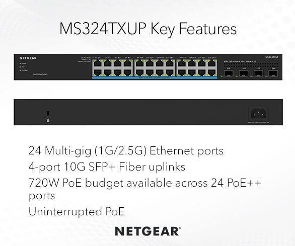 2.5G/1G マルチギガポートを24基と専用SFP+スロットを4基搭載したL2+スマートスイッチ。24ポートがIEEE 802.3bt PoE++に対応しており、1ポートあたり60W、スイッチ全体で720Wの電力を供給する。Insightに対応しており、InsightアプリやWebでどこからでも設定変更や監視が可能な、クラウド管理機能を搭載 (Insight PremiumまたはProライセンスが必要。1年間無料)。また、スタンドアロンモードに設定することで通常のスマートスイッチとしても使える。Insightアプリ、Web GUIどちらも日本語での表示が可能。VLAN、QoSに加え、VLAN間ルーティング、スタティックルーティング、プロテクトポート、SNMP、ループ防止等に対応。ラックマウントキット付属。