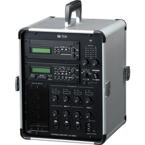 定格出力120 W(4 Ω負荷)のデジタルアンプを2チャンネル搭載し大出力が可能な、業務用として持ち運びに便利なアルミケースに組み込んだSD/USBプレーヤー、CDプレーヤー付のポータブル型アンプです。チューナーユニットは合計4台まで装着できます。最適な音質を4つのパターンから選択できるシーンモードを搭載しています。また、ハウリング抑制機能を搭載しています。(適用:有線マイク、ワイヤレスマイク)