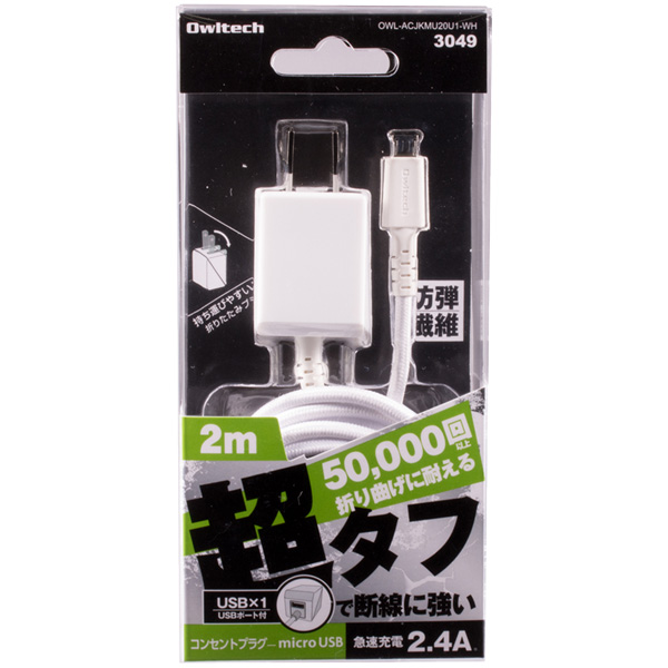 | 商品名 | 高い耐性を誇る新素材のアラミド繊維を採用した超タフmicroUSBケーブル 一体型AC充電器 ホワイト |