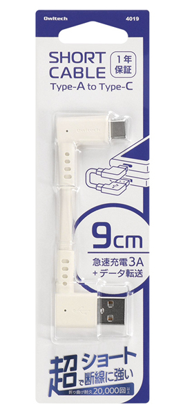 スマートフォン用USBケーブル/ショートケーブル/A-C/(Aオス-Cオス)/データ転送/L字コネクタ/断線に強い/9cm/90mm/キナリ