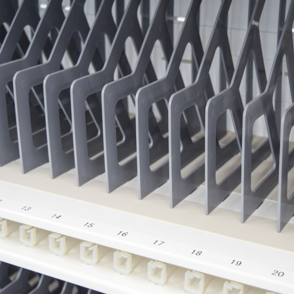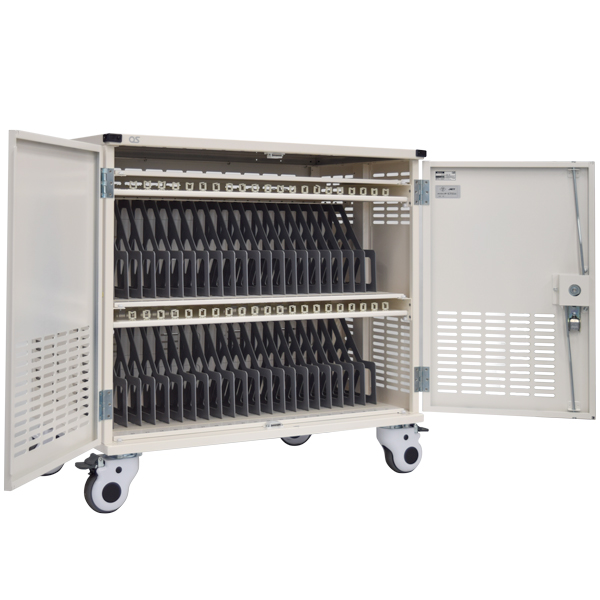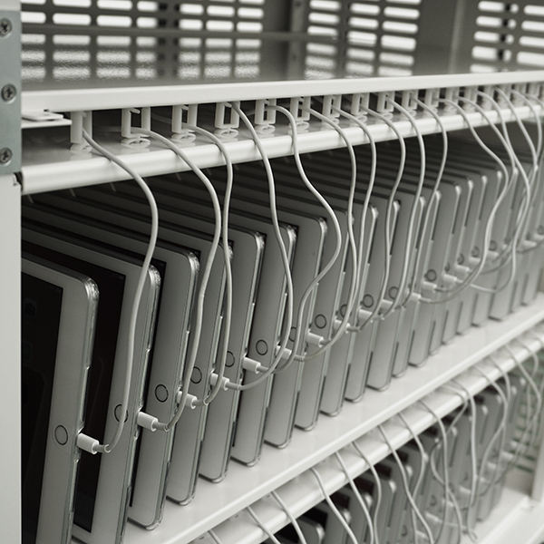◆GIGAスクール構想に対応! ◆9~14インチ相当のPC端末やタブレットを最大42台収納 ◆輪番2回路(デジタルタイマー)機能でブレーカーに負担を掛けず安全に充電が可能 ◆車輪回転止めと、車軸回転止めのダブルストッパー機構を備えたO100のキャスターを標準装備 ◆上部四隅にコーナーカバーを取り付け、生徒・児童がぶつかった場合の安全性に配慮 ◆簡単にロックと解除ができるフットストッパーと、ネジ止めで床面と固着が可能なヒンジ固定金具(L字金具)が標準付属 ◆外形寸法:W850mm×D500mm×H820mm ◆端末収納部有効寸法:W325mm×D230mm×H32mm(1台あたり) ◆定格容量:AC100V 15A 1500W 50/60Hz ◆充電容量:最大71W/台 合計1500W以下 ◆タイマー設定:14プログラム×2回路 ◆推奨使用温度:17℃~28℃ ◆2梱包
