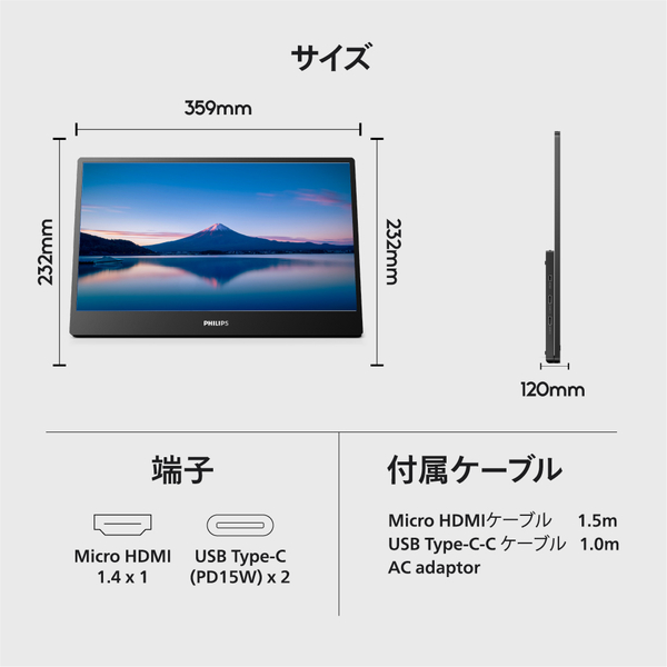| ケーブル | micro HDMI - HDMI ケーブル 1.5M、USB Type-C-C ケーブル 1.0M、AC adaptor |