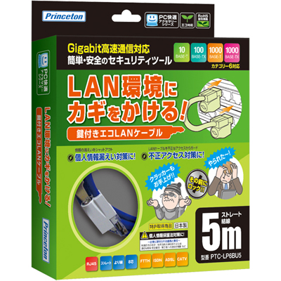 頭に鍵がついたLANケーブルです。ハブやPCに接続し、付属の鍵で施錠すれば、不正な脱着を防止することが可能。 個人情報漏えい対策や、不正アクセス対策に効果を発揮します。また16ポートや24ポートHUBにも対応可能、環境に配慮しエコ素材を使用し、Gigabit環境にも対応できる、CAT6ケーブル採用しました。