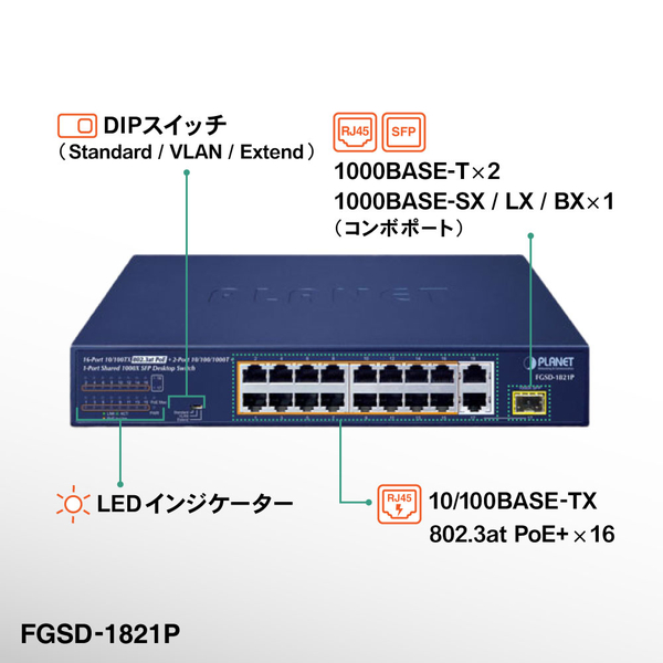 | 商品名 | PoE+ファストイーサネットスイッチングハブギガ・SX/LX/BX SFPコンボポート付 16ポート |