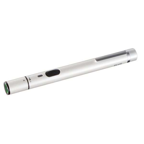 新方式ダイレクトグリーン搭載PLUSグリーンレーザーポインター。新設計のズーム機構は光学系を見直すことでスッキリとした輪郭のスポット径。緑色光約8倍のズーム倍率。電池寿命約20時間の長寿命。低温環境でもすぐに点灯(0℃-35℃)*従来15℃-35℃。
