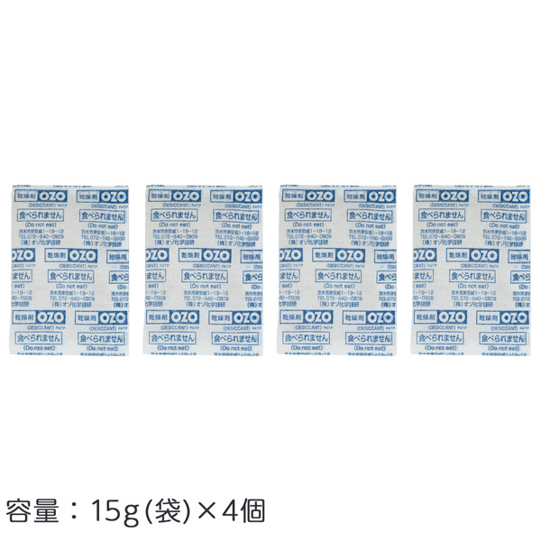 強力乾燥剤“OZO-S15即効タイプ”は海水ミネラルを主成分とした天然系型の乾燥剤です。シリカゲルの4~7倍の吸湿力を持ち、容器内の湿度を急速に下げることが出来ます。(S即効タイプ:約24時間)化学反応によって吸湿を行うので、気温に左右されずに常に一定の吸湿力を発揮します。一度吸湿した水分は殆ど放出されない為、温度差による結露の予防にたいへん効果的です。吸湿力調整用カバーが付属。湿度が下がり過ぎてしまう時に乾燥剤に被せて使用します。海水ミネラルを主成分としている為、水に濡れても殆ど発熱せず、安心して使うことが出来ます。天然系型乾燥剤の為、利用後は「可燃ごみ」として捨てることが出来ます。商品パッケージにチャック付きアルミ密閉パックを使用しているので、乾燥剤の保存に便利です。■成分:塩化マグネシウム、酸化マグネシウム■本体袋材質:耐水紙■容量:15g(袋)×4個■持続期間(目安):6~10ヶ月