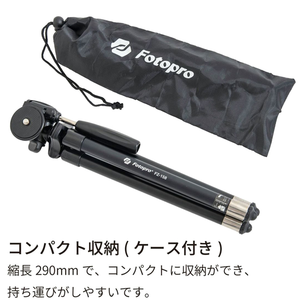 | 商品名 | Fotopro 三脚 FZ-158+ ブラック スマートフォンホルダー・GoProアダプター・Bluetoothリモコン付 |