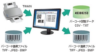 イメージスキャナで取得したバーコードイメージをパソコンでデコードし、データを出力します。また、イメージスキャナで読み取ったイメージファイル名は、意味のないユニークな番号になっていますので、文書検索が困難です。そこで、生産指示番号、製品番号、注文番号、文書番号等を予めバーコード印刷しておくことにより、そのデータ名でファイル保存することができます。