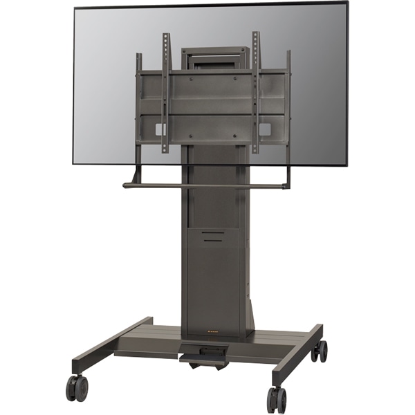 【ガス圧式昇降スタンド(電源不要)】60インチクラスの大型ディスプレイ対応。ベース下部のフットペダルを踏み込み、ハンドルを上げ下げすることでディスプレイを上下200mmのストロークが可能。ディスプレイ設置後も楽々高さ調整ができます。