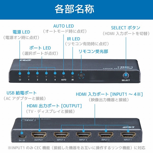 | 商品名 | 8K60Hz/4K120Hz対応 4入力1出力 HDMI切替器 |