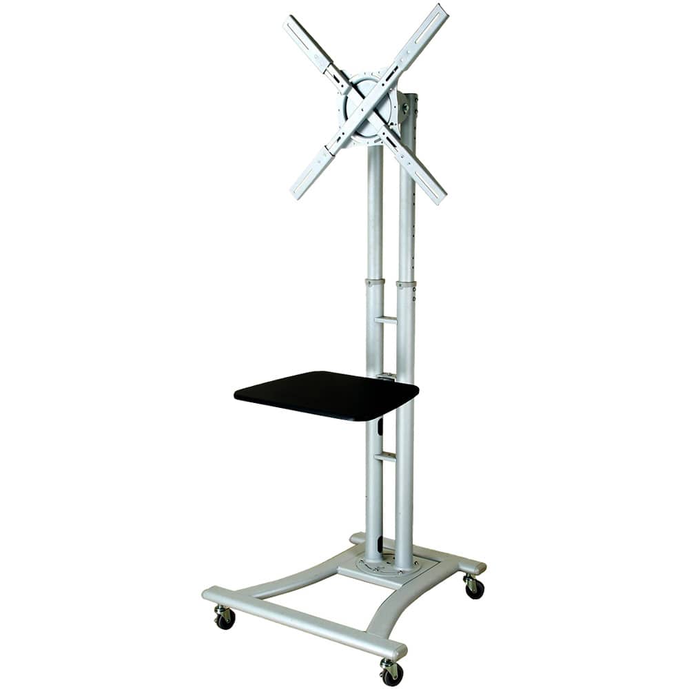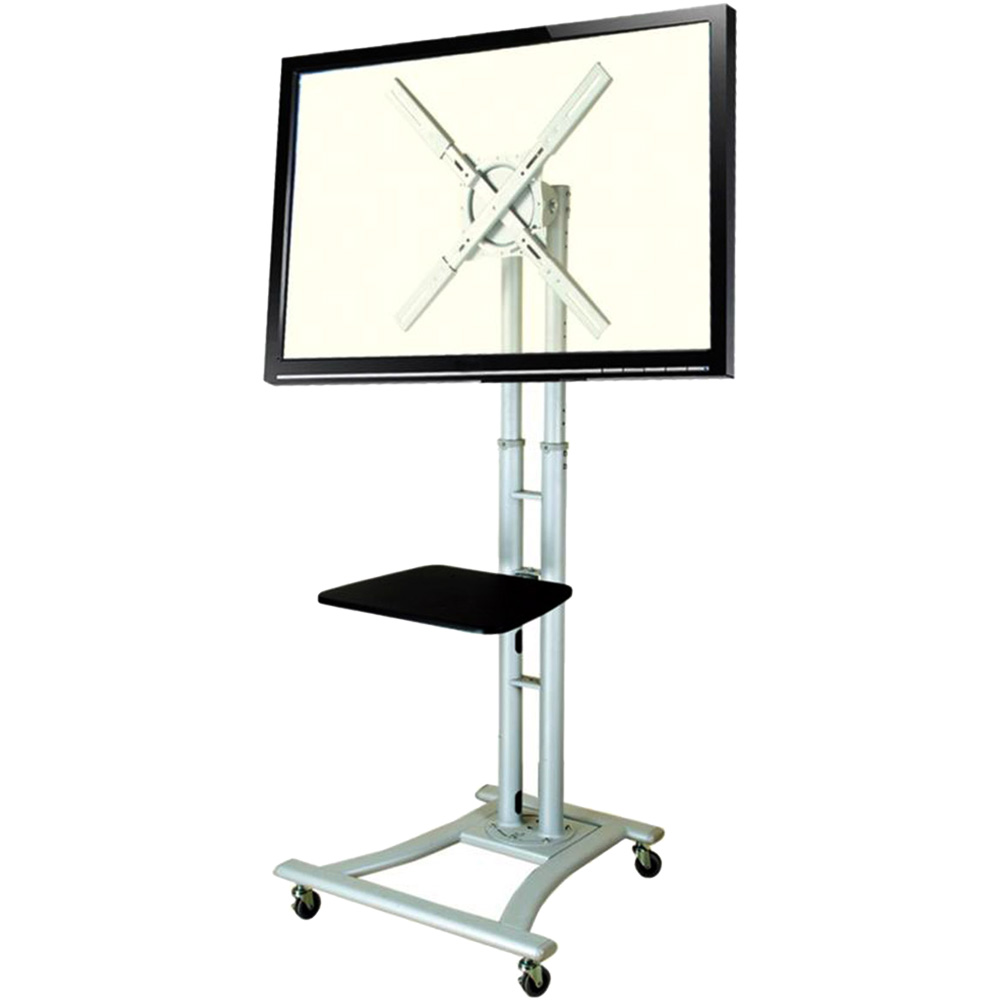 32~60インチの大型テレビを、縦にも横にもセットできる、キャスター付きのテレビ型スタンドです。テレビやモニターが設置できるVESA規格で、最大800×600mm。一度横にセットしても、テレビを取り付けた部分が90度回転するので、サッと簡単に縦にセットし直すことができます。地上から最大で約180cm、最小で約110cmと広い高さ調整が可能。DVDプレイヤーなどが置けるテーブルがスタンドに付属し、スタンドの足には、4つのキャスターが付いているので、移動も自由自在。